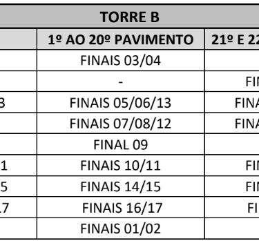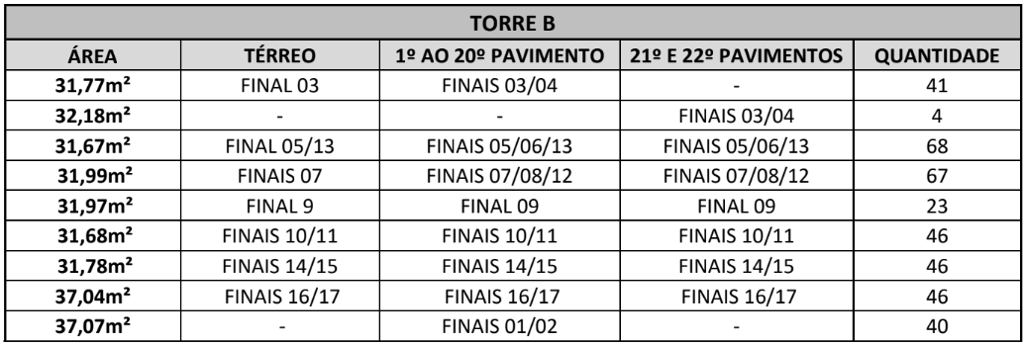 TORRE B: TÉRREO – 11 UNIDS. / 1o AO 20o PAV. - 17 UNIDS. / 21o E 22o PAVS. – 15 UNIDS.
