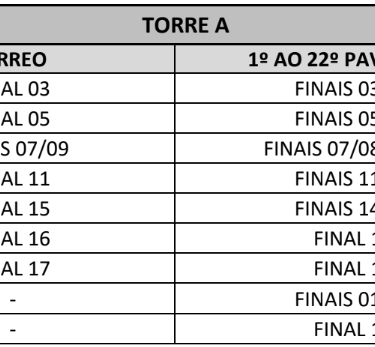 TORRE A: TÉRREO – 08 UNIDS. / 1o AO 22o - 17 UNIDS.